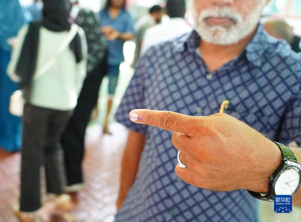 9月9日,在馬爾代夫馬累,一名選民投票后展示做過(guò)標記的手指。