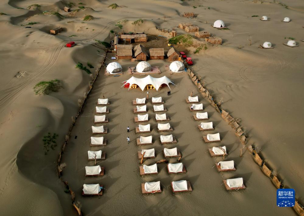 這是新疆喀什地區麥蓋提縣N39°沙漠旅游景區內的營(yíng)地(9月7日攝,無(wú)人機照片)。