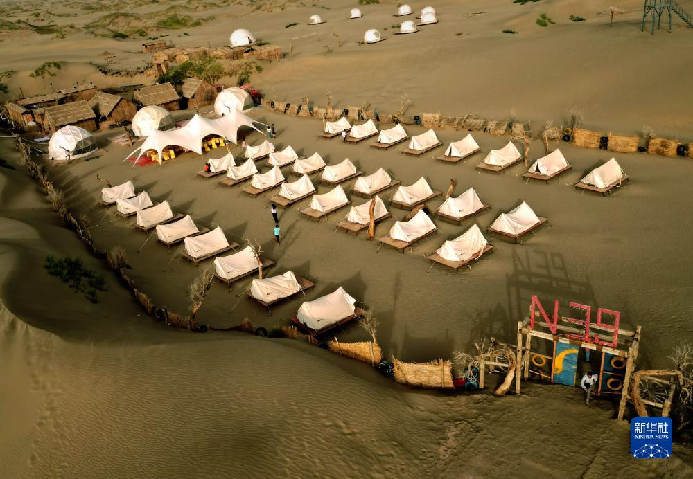 這是新疆喀什地區麥蓋提縣N39°沙漠旅游景區內的營(yíng)地(9月7日攝,無(wú)人機照片)。