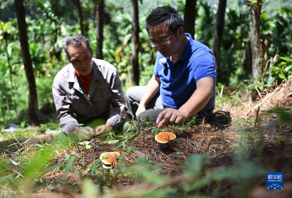 9月6日,曾念開(kāi)(右)在指導海南省保亭黎族苗族自治縣毛感鄉的農民種植靈芝。