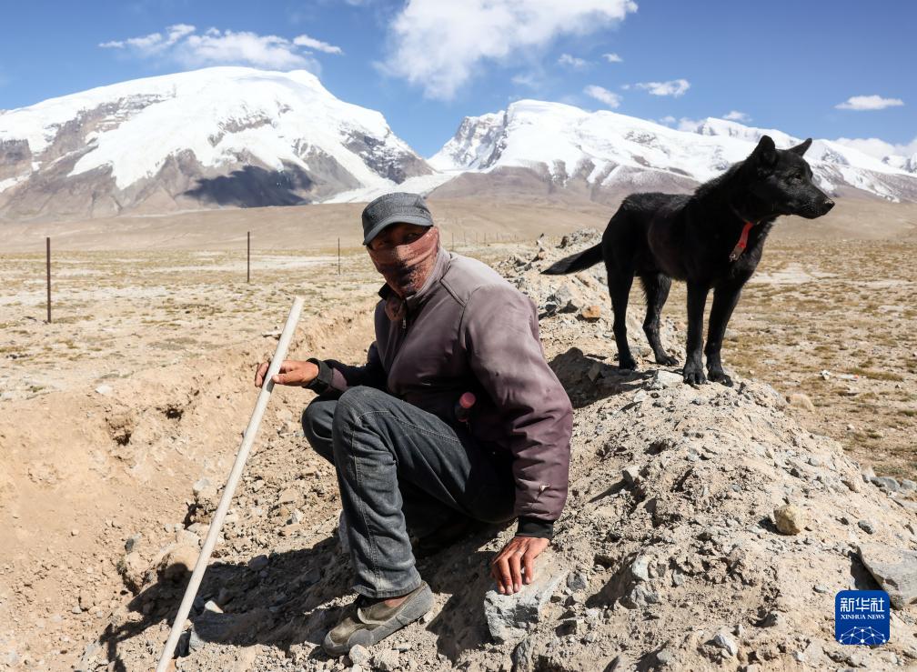 今年39歲的塔合曼鄉薩熱拉村牧民庫爾班艾里·買(mǎi)達賽因與牧羊犬“黑狼”一起遠遠地看著(zhù)羊群(9月6日攝)。