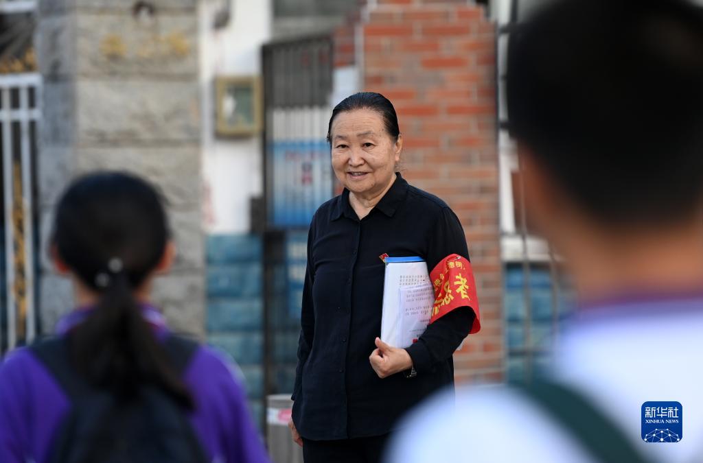 張慧穎在津英中學(xué)門(mén)口迎接學(xué)生入校(9月8日攝)。