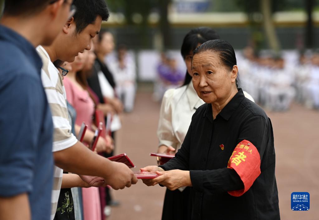 張慧穎在津英中學(xué)操場(chǎng)上向學(xué)校老師頒發(fā)榮譽(yù)證書(shū)(9月8日攝)。