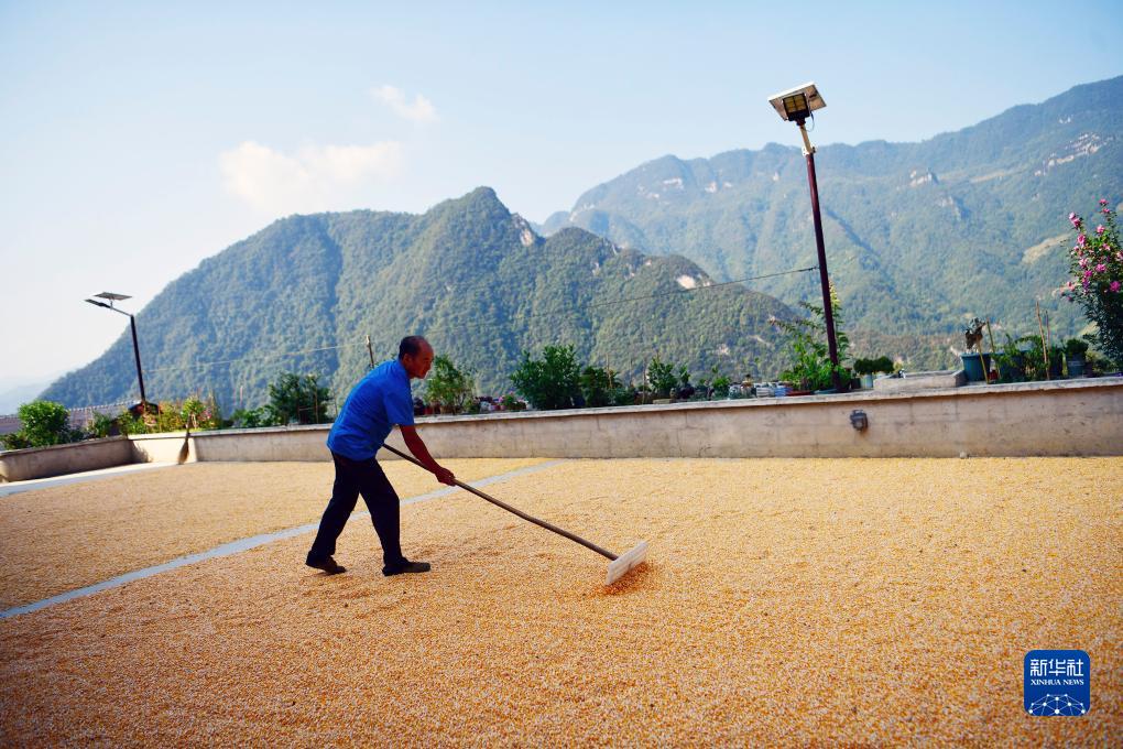 9月9日,秭歸縣九畹溪鎮穿心店村村民在翻曬收獲的玉米。