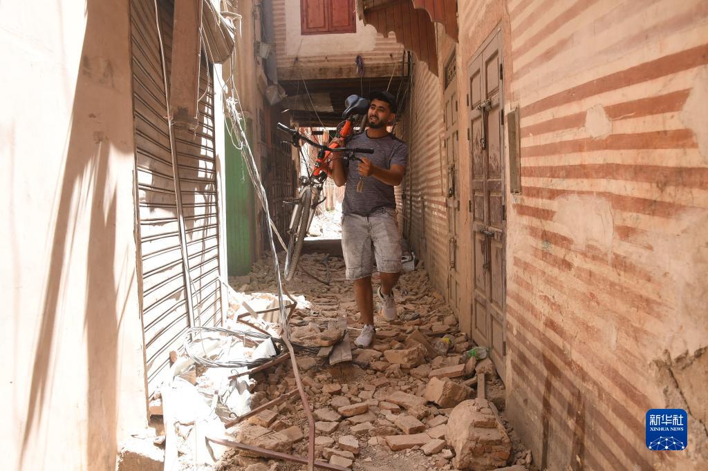 9月9日,在摩洛哥南部城市馬拉喀什,一名男子走在震后的街道上。