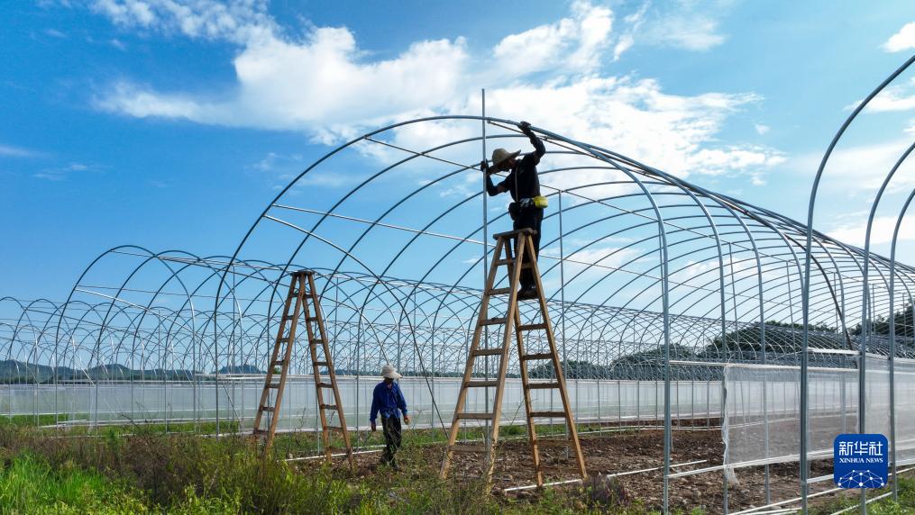 9月9日,工人在常寧市洋泉鎮巷坪村智慧育苗大棚施工現場(chǎng)施工。