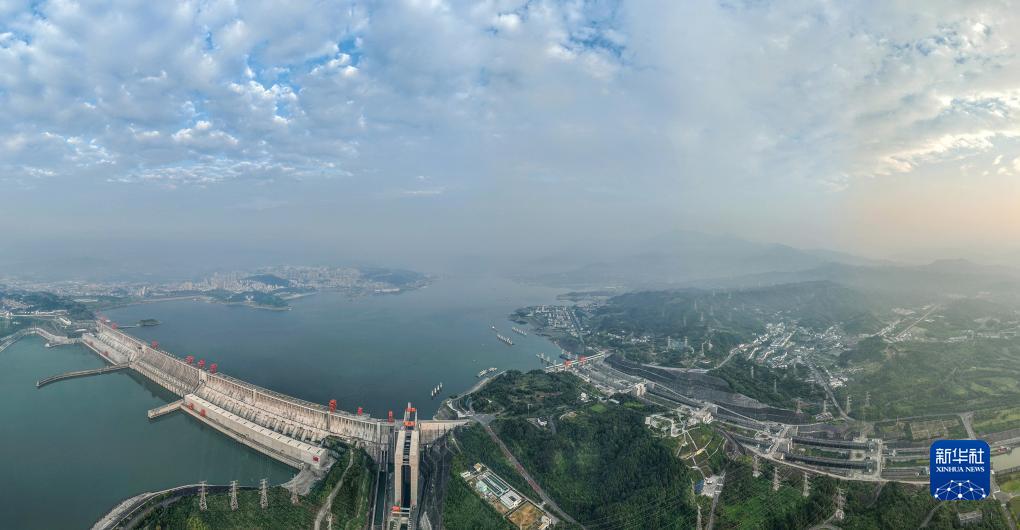 9月10日,船舶在湖北省宜昌市有序通過(guò)三峽雙線(xiàn)五級船閘(無(wú)人機全景照片)。