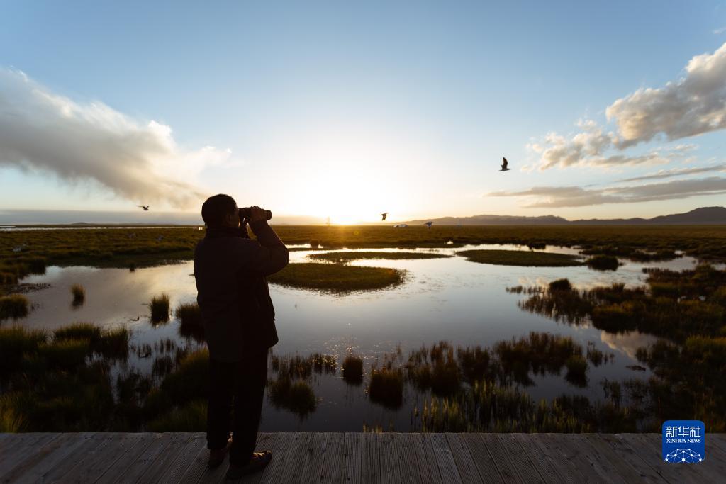 濕地生態(tài)管護員如科在四川省阿壩藏族羌族自治州若爾蓋縣花湖用望遠鏡觀(guān)察周邊環(huán)境(8月22日攝)。