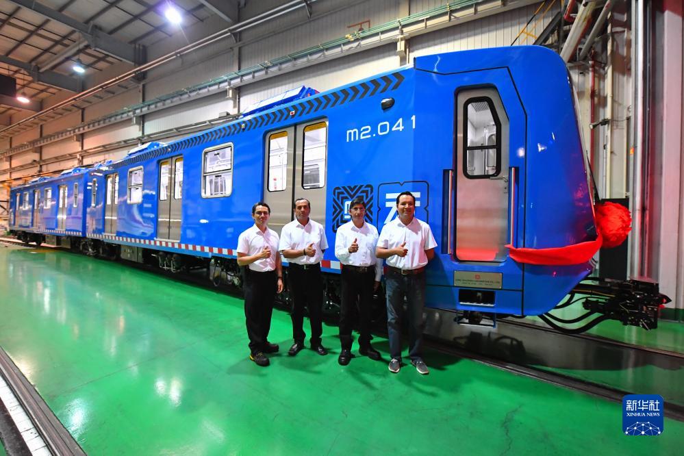 墨西哥來(lái)賓在中國中車(chē)出口墨西哥城輕軌列車(chē)首列車(chē)旁合影(9月9日攝)。