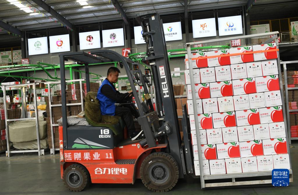 9月10日,在洛川蘋(píng)果現代產(chǎn)業(yè)園,工作人員準備將裝箱后的蘋(píng)果運輸上車(chē)。