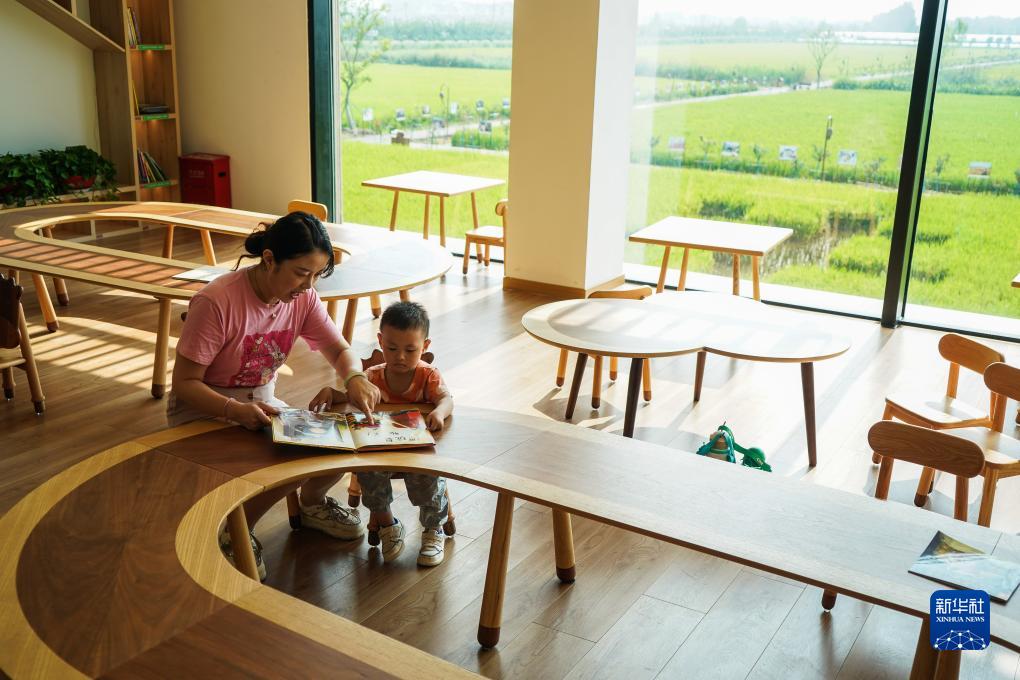 9月9日,在宿遷市宿城區蔡集鎮牛角村歡樂(lè )田園度假區,小朋友在“稻田書(shū)屋”聽(tīng)繪本故事。