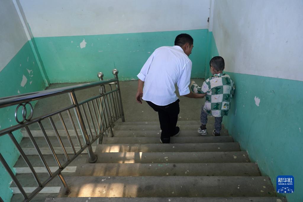 在江西省高安市華林山鎮中心小學(xué)朱家教學(xué)點(diǎn),李新江(左)牽著(zhù)小澤下樓(9月4日攝)。