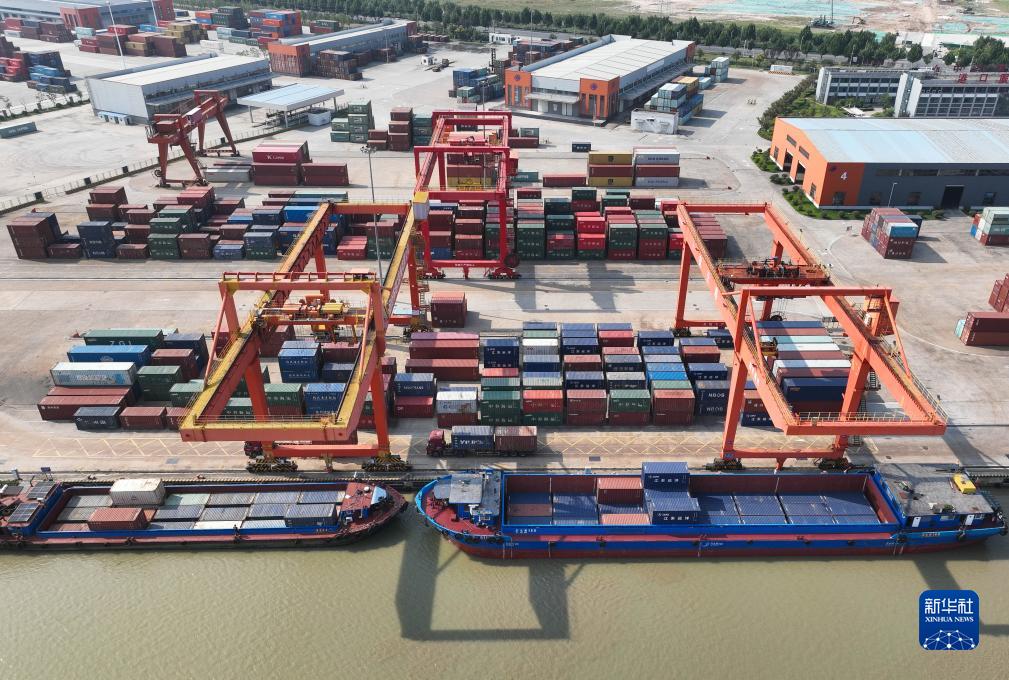 9月10日,在運河宿遷港集裝箱碼頭,大型機械在吊裝集裝箱(無(wú)人機照片)。