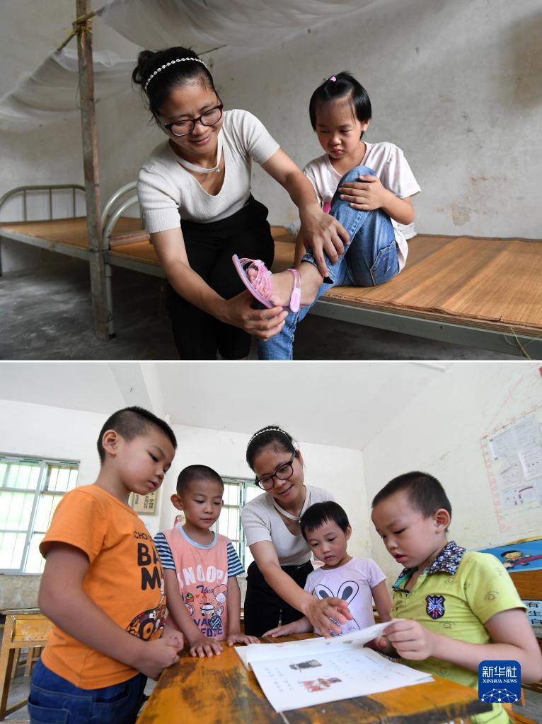 拼版照片:廣西都安瑤族自治縣龍灣鄉琴棋小學(xué)的藍巧春老師幫一名學(xué)生脫鞋準備睡午覺(jué)(上圖),藍巧春老師課間輔導學(xué)生功課(下圖)(2017年8月31日攝)。1988年出生的藍巧春畢業(yè)后曾在南寧市工作。聽(tīng)到家鄉招聘教師后,她回到了大山。由于有學(xué)生寄宿學(xué)校,她每天除了給學(xué)生上課,還要給他們做飯,照顧他們的起居。