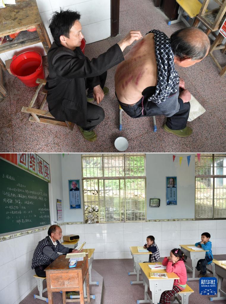 拼版照片:在廣西全州縣東山瑤族鄉金雞源教學(xué)點(diǎn),盤(pán)榮在給父親盤(pán)紹衛老師(右)刮痧(上圖),金雞源教學(xué)點(diǎn)的盤(pán)紹衛老師在課堂上(下圖)(2016年4月27日攝)。時(shí)年62歲的盤(pán)紹衛是廣西全州縣東山瑤族鄉金雞源教學(xué)點(diǎn)唯一的老師,因暫時(shí)沒(méi)有新老師來(lái)接替他的崗位,他接受返聘回到已經(jīng)堅守41年的講臺。