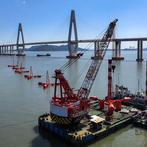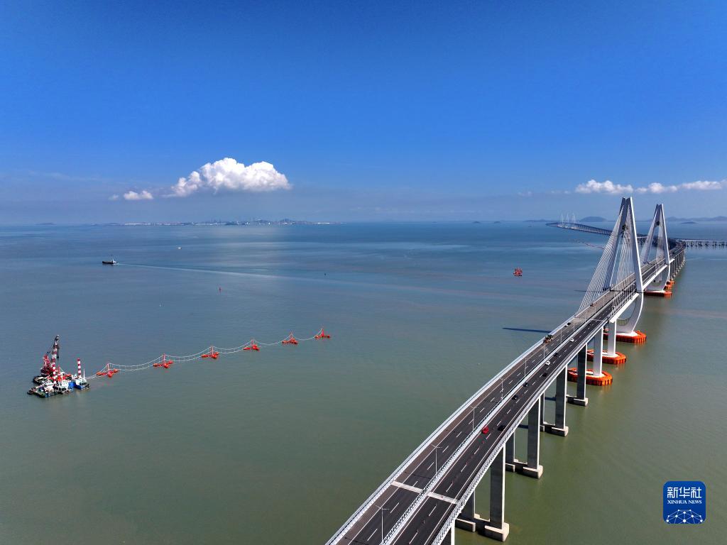 9月10日,一艘工程船在舟山市定海區馬目海邊為舟岱大橋南通航孔橋安裝防船舶撞擊系統(無(wú)人機照片)。
