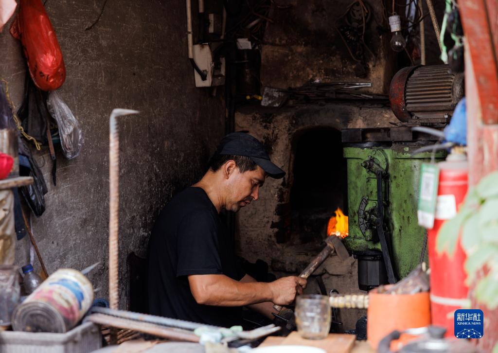 在新疆喀什古城景區內,手藝人在制作鐵器(9月7日攝)。