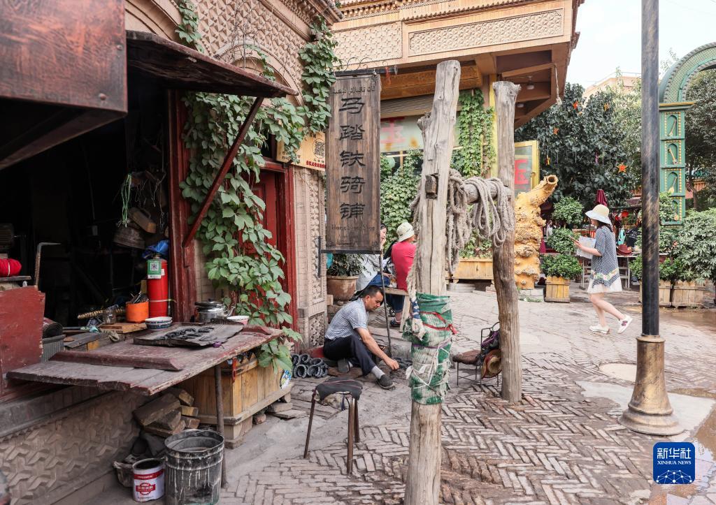 在新疆喀什古城景區內,手藝人在制作鐵器(9月7日攝)。
