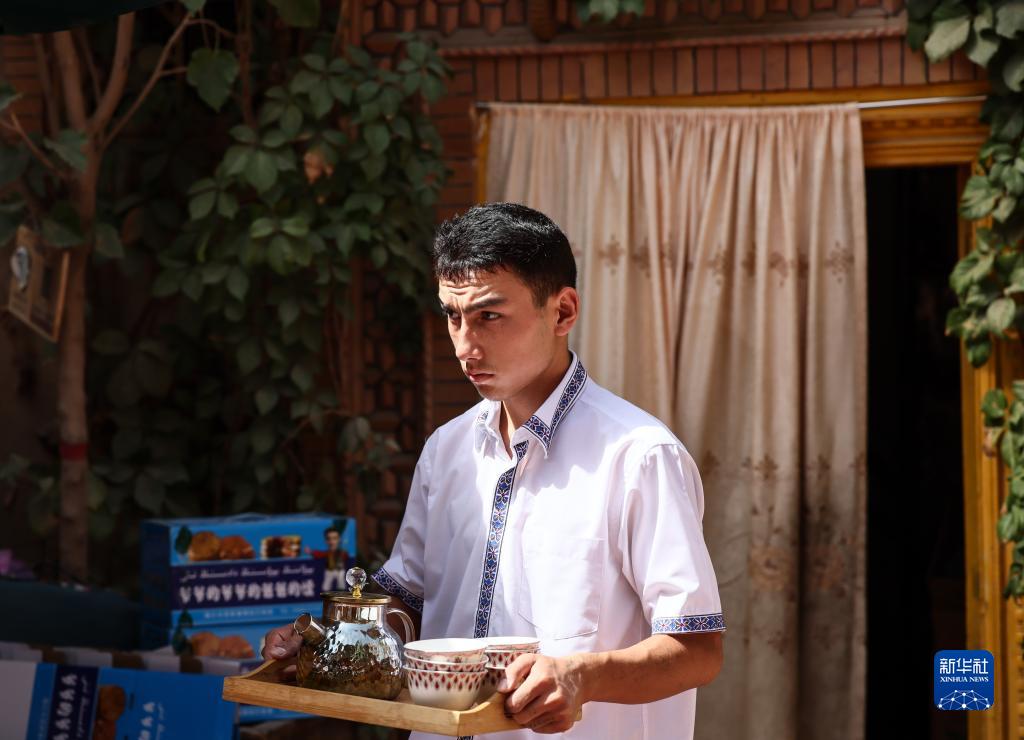 在新疆喀什古城景區“爺爺的爺爺的爸爸的馕”打馕店,工作人員端著(zhù)托盤(pán)從屋內走出(9月7日攝)。