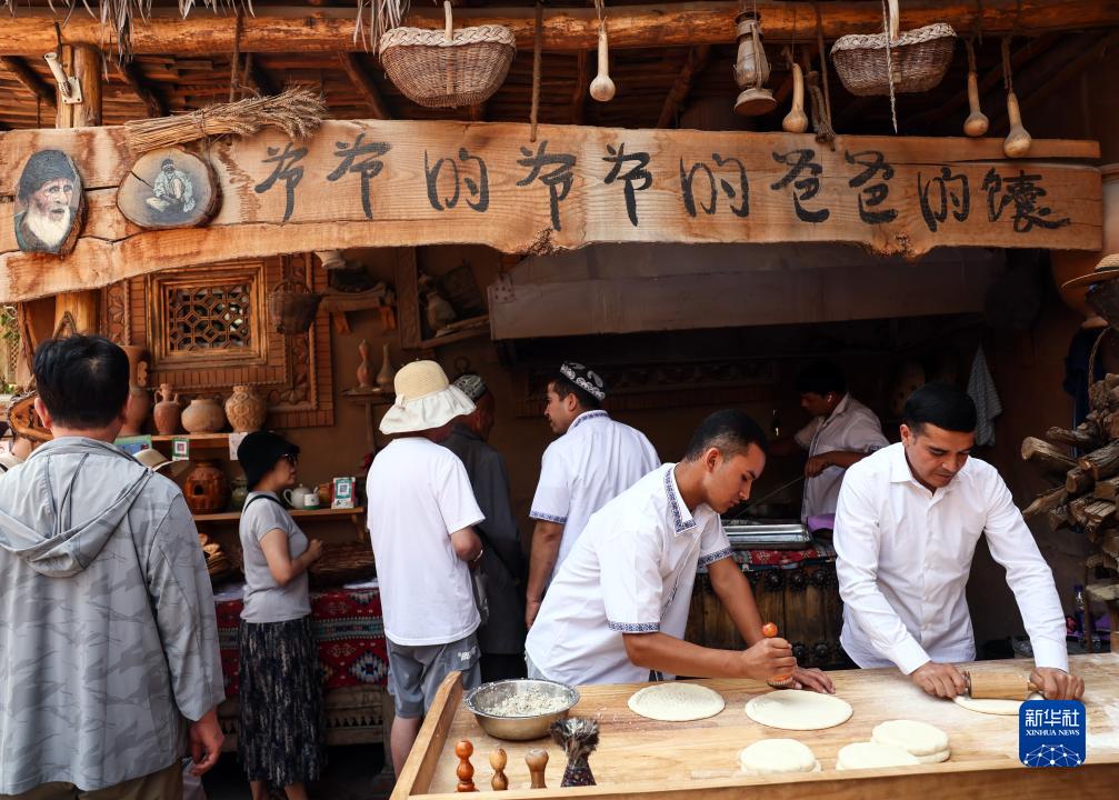 在新疆喀什古城景區“爺爺的爺爺的爸爸的馕”打馕店,工作人員在制作馕坯(9月7日攝)。