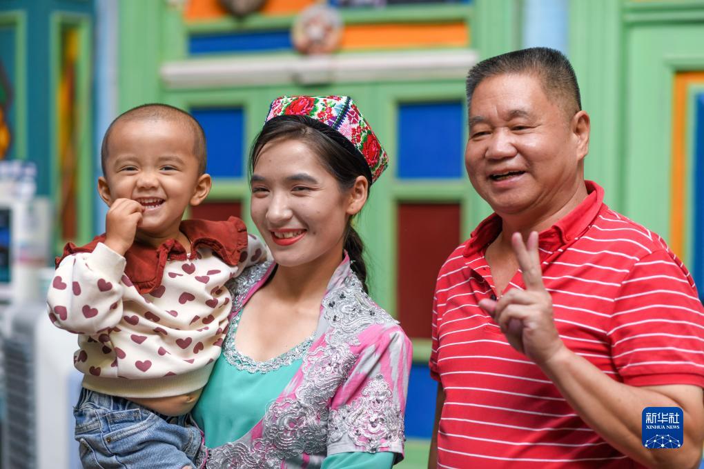 在新疆喀什古城景區“古麗的家”旅游家訪(fǎng)點(diǎn),游客在與演員合影留念(9月7日攝)。