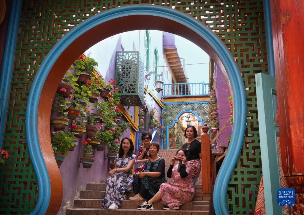 在新疆喀什古城景區內,游客在拍照留念(9月8日攝)。