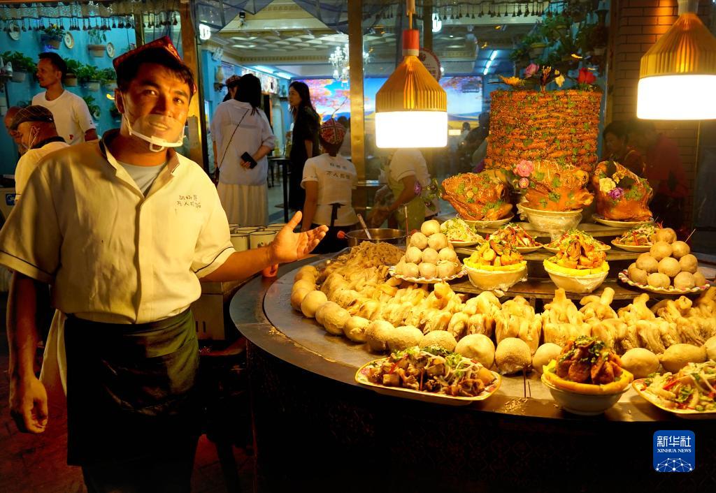 在新疆喀什古城景區內,工作人員在夜市上出售美食(9月4日攝)。
