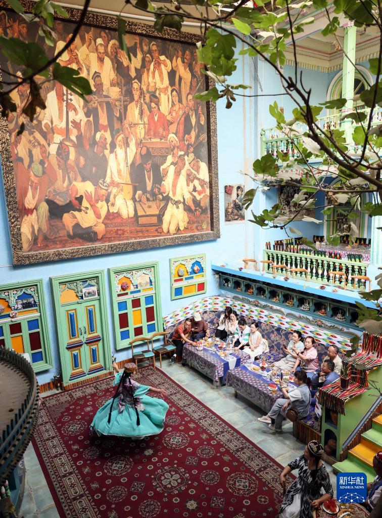 在新疆喀什古城景區“古麗的家”旅游家訪(fǎng)點(diǎn),演員在隨音樂(lè )起舞(9月7日攝)。