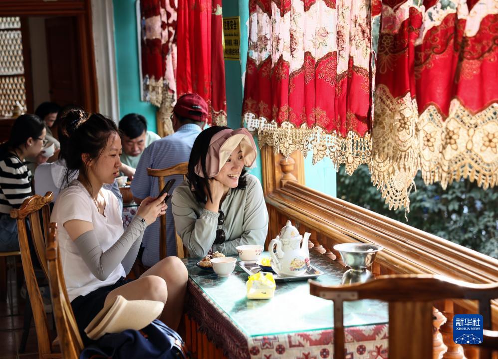 在新疆喀什古城景區百年老茶館內,游客在品茶小憩(9月7日攝)。