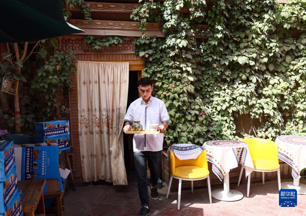在新疆喀什古城景區“爺爺的爺爺的爸爸的馕”打馕店,工作人員端著(zhù)托盤(pán)從屋內走出(9月7日攝)。