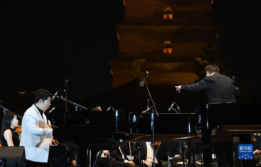 9月10日晚,鋼琴家郎朗(左)、指揮家呂嘉(右)與西安交響樂(lè )團在西安大雁塔北廣場(chǎng)戶(hù)外公演。
