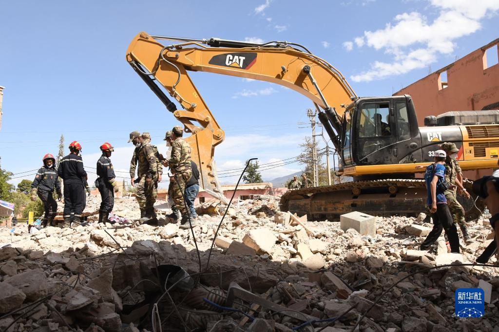 9月10日,在摩洛哥震中附近的艾茲魯村,救援人員在倒塌建筑上實(shí)施搜救。