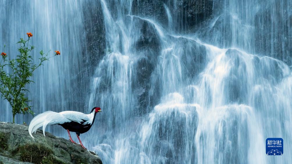 9月9日,一只白鷴停留在瀑布旁的石頭上。