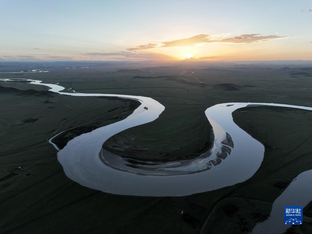 這是8月21日在四川省阿壩藏族羌族自治州若爾蓋縣唐克鎮拍攝的黃河九曲第一灣落日(無(wú)人機照片)。