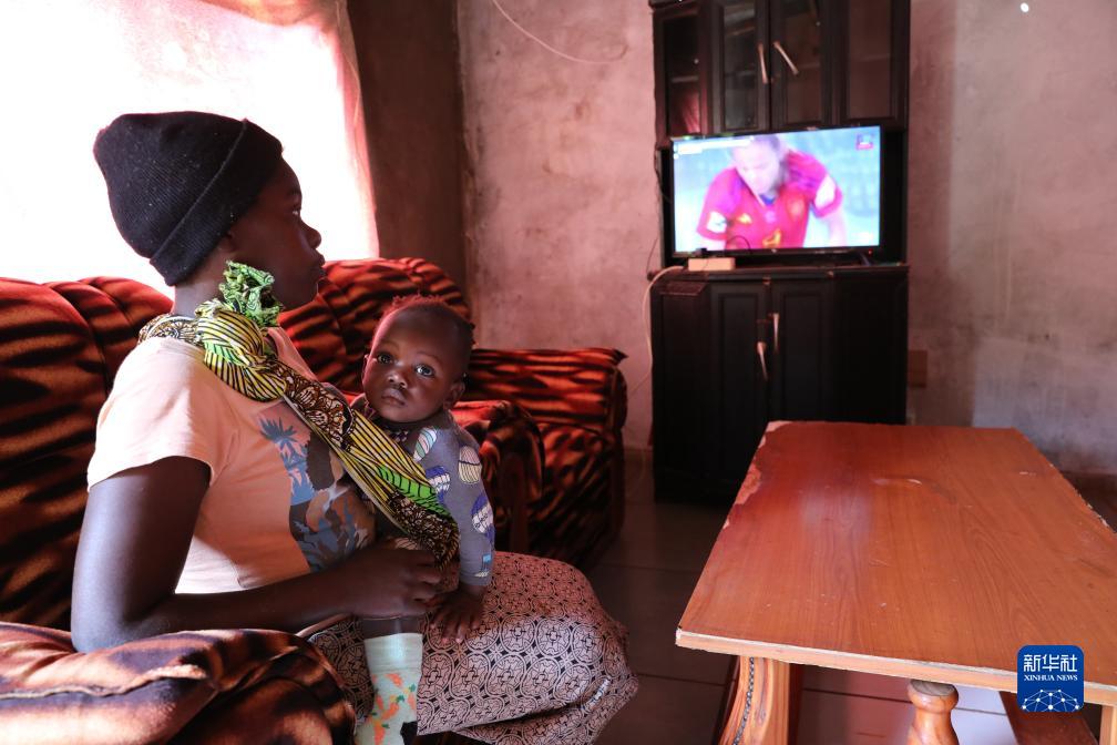 7月26日,在莫桑比克馬普托省戈巴村,村民抱著(zhù)孩子在家中收看衛星電視節目。