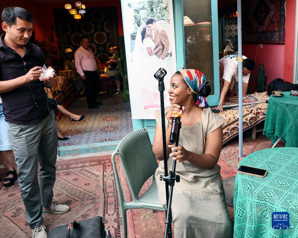 海迪雅在自家咖啡館前唱歌(9月7日攝)。