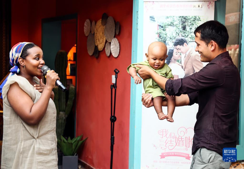 海迪雅在自家咖啡館前唱歌,丈夫迪力夏提抱著(zhù)孩子與她互動(dòng)(9月7日攝)。