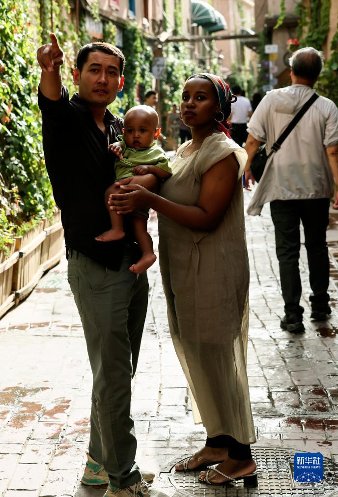 迪力夏提抱著(zhù)孩子和海迪雅走在喀什古城景區的巷道內(9月7日攝)。