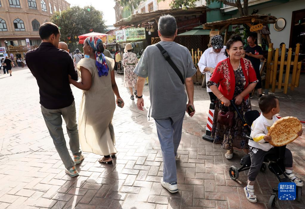 迪力夏提(左)抱著(zhù)孩子和海迪雅走在喀什古城景區的巷道內(9月7日攝)。