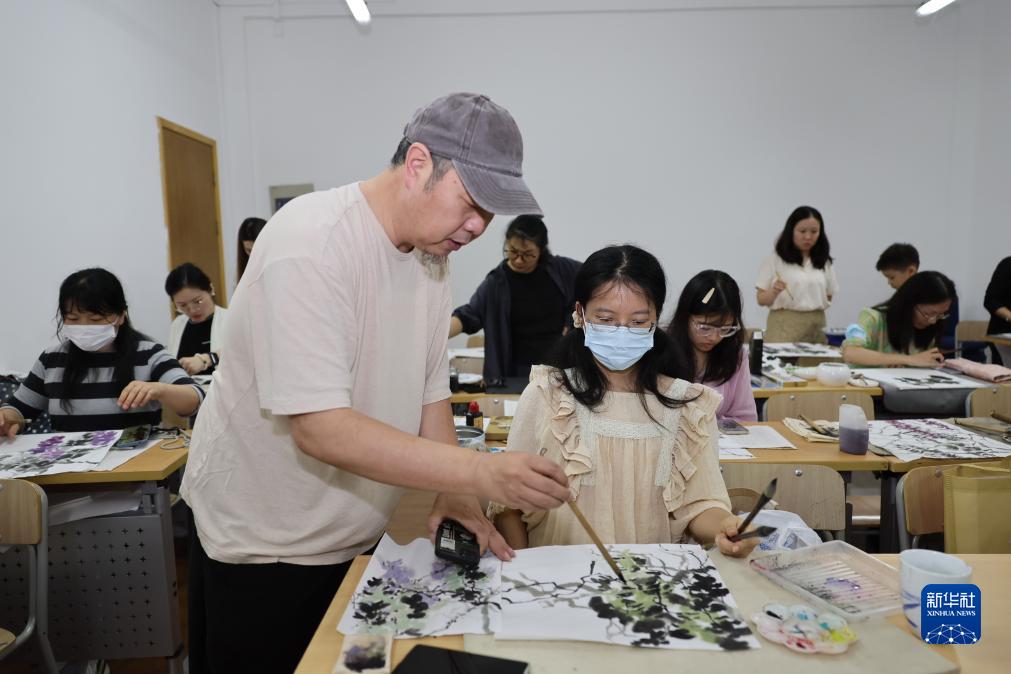 9月11日,在上海市群眾藝術(shù)館,老師指導學(xué)員畫(huà)國畫(huà)。