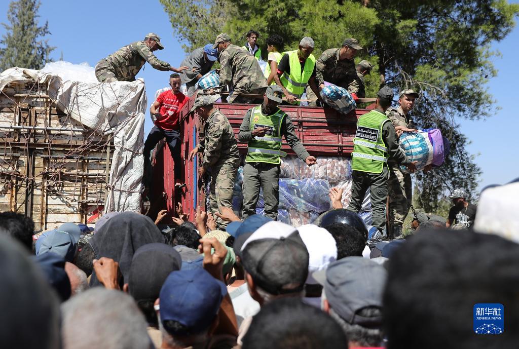 9月11日,救援人員在摩洛哥馬拉喀什南部的艾米茲米茲村分發(fā)救災物資。