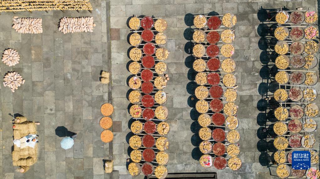 地處皖南山區的安徽省黃山市徽州區呈坎古村自古都有曬秋習俗。近年來(lái),曬秋時(shí)節,該村村民會(huì )將農作物在村中廣場(chǎng)集中晾曬,構成一幅五谷豐登的秋收畫(huà)卷,吸引不少游客前往觀(guān)賞,成為當地秋日里的旅游特色。