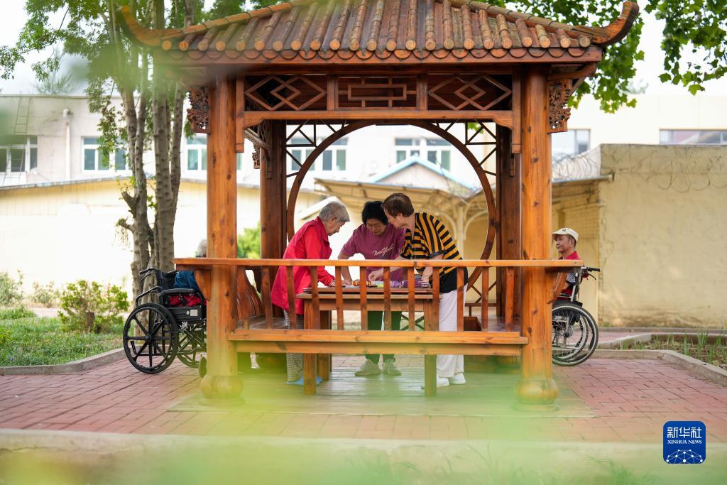 9月12日,老人們在河北省唐山市古冶區一家養老機構的院子里下棋。