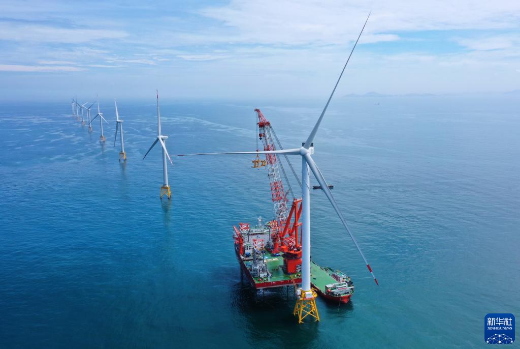 全球首臺16兆瓦大容量海上風(fēng)電機組在福建北部海域安裝完成(2023年6月28日攝,無(wú)人機照片)。