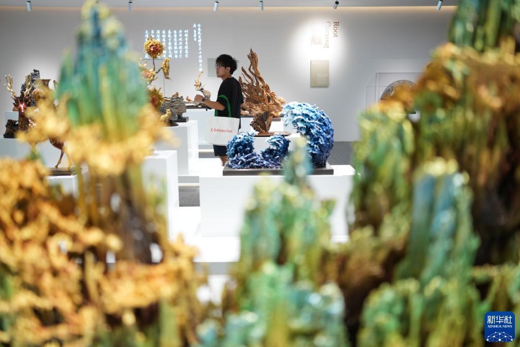 9月12日,媒體記者參觀(guān)亞運村內展示的銅雕、根雕作品。
