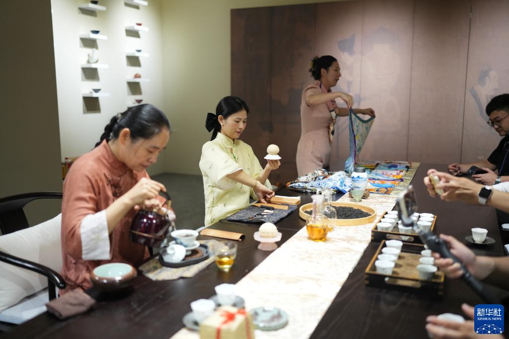 9月12日,工作人員在亞運村內展示茶藝、茶點(diǎn)、絲綢。