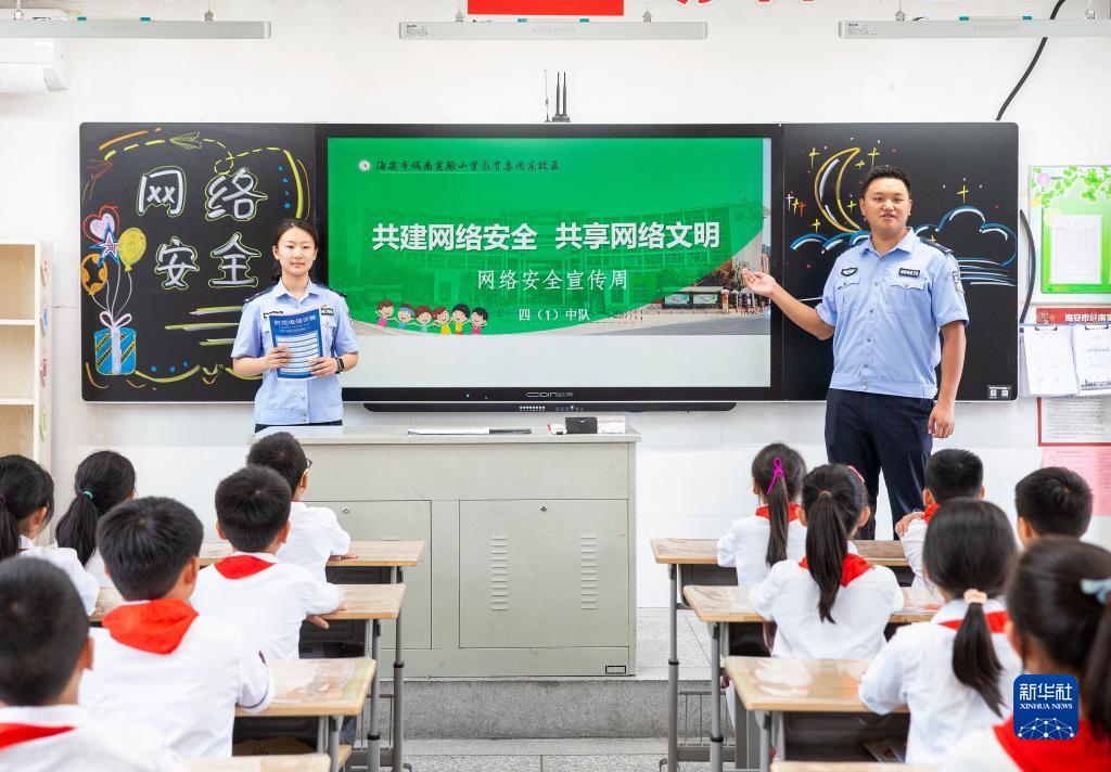 9月11日,在江蘇省海安經(jīng)濟開(kāi)發(fā)區實(shí)驗小學(xué),海安市公安局城東派出所民警在給小學(xué)生普及網(wǎng)絡(luò )安全知識。