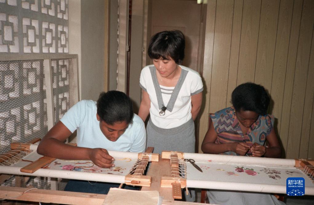 這是中國刺繡技術(shù)人員張建向巴巴多斯學(xué)員傳授刺繡針?lè )ǎ?986年攝)。當地工藝美術(shù)工人經(jīng)過(guò)一年培訓,基本上掌握了中國刺繡的傳統工藝,使得具有悠久歷史的中國刺繡在這個(gè)加勒比海島國開(kāi)花結果。