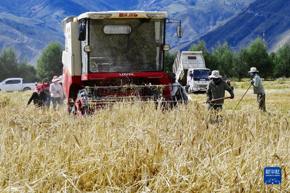 近日,西藏拉薩市曲水縣青稞成熟,人們忙著(zhù)收割青稞,感受豐收的喜悅。