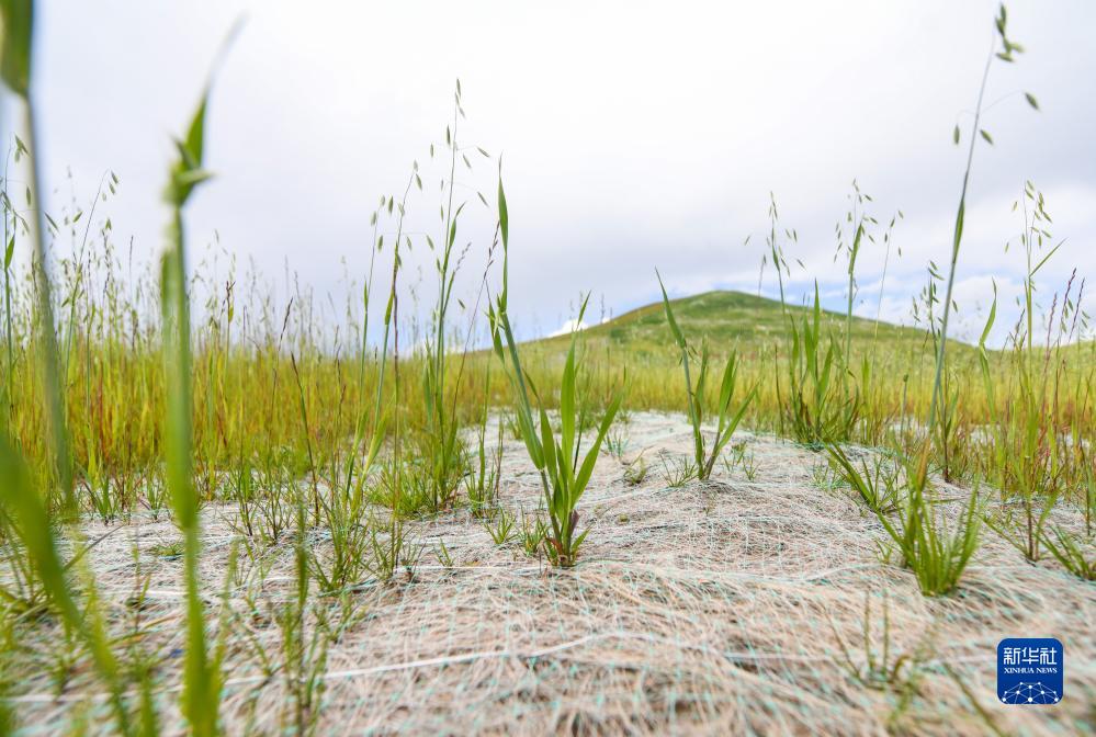 若爾蓋縣唐克鎮嘎?tīng)柆敶宓牟菰鷳B(tài)修復項目已完成近三個(gè)月。披堿草、老芒麥、高冰草和黑麥草等從椰絲毯織成的小方格中破土而出,最高已近半米,成為攻克生態(tài)修復難點(diǎn)、治愈草原“傷疤”的希望。
